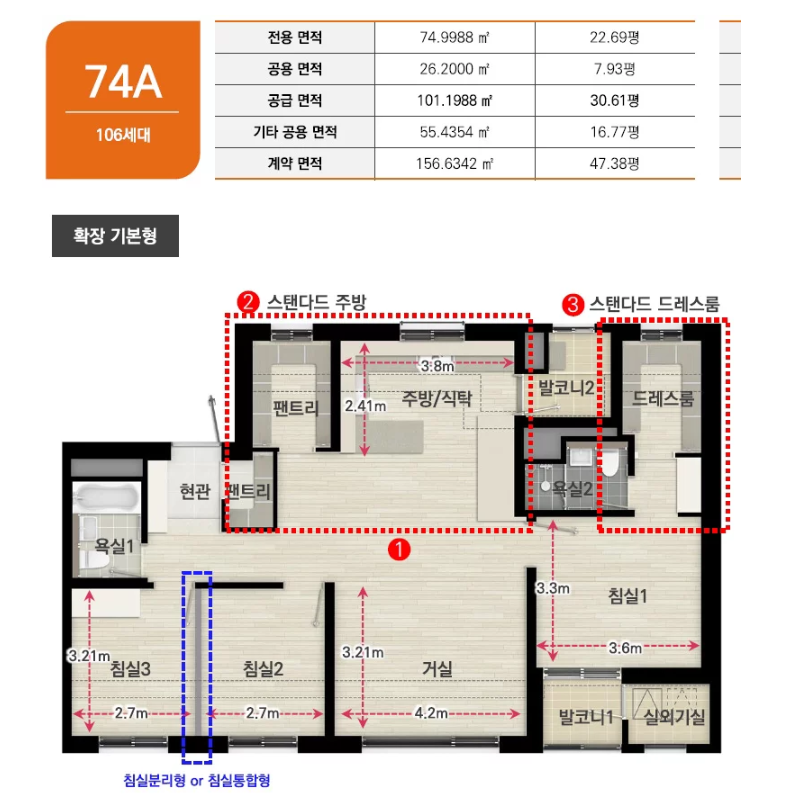 • 74㎡: 틈새 평형의 효율성을 극대화한 구조