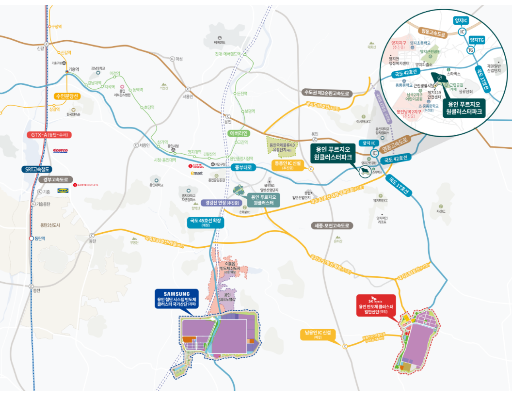 특히 반도체 국가산단으로의 접근로가 추가로 확보되면서 직주근접의 가치는 날이 갈수록 높아질 것입니다. 산업 호재에 교통 호재까지 더해진 용인 푸르지오 원클러스터파크는 실거주 편의성과 투자 가치를 동시에 만족시키는 독보적인 선택지가 될 것입니다. 또한 GTX 노선과의 연계성까지 고려한다면 장기적인 시세 차익 측면에서도 처인구 내 타 단지들을 압도할 수 있는 경쟁력을 보유하고 있습니다.