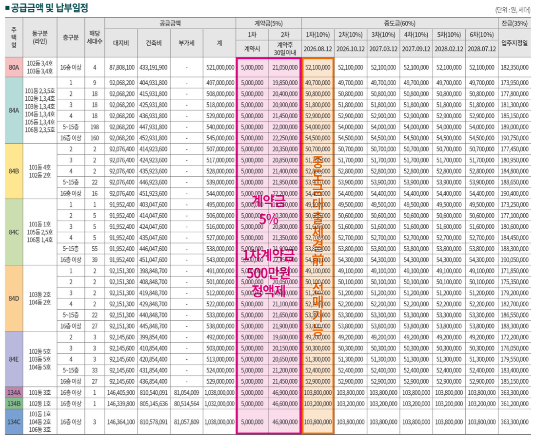 가장 중요한 포인트인 분양가를 살펴보겠습니다. 전용 84㎡(국민평형) 기준 분양가는 약 5억 원대 중후반으로 형성되어 있습니다. 이는 최근 서울 신축 아파트가 15억 원을 돌파하고, 인근 동탄 신도시가 10억 원을 훌쩍 넘긴 상황과 비교하면 거의 절반 수준의 합리적인 금액입니다.