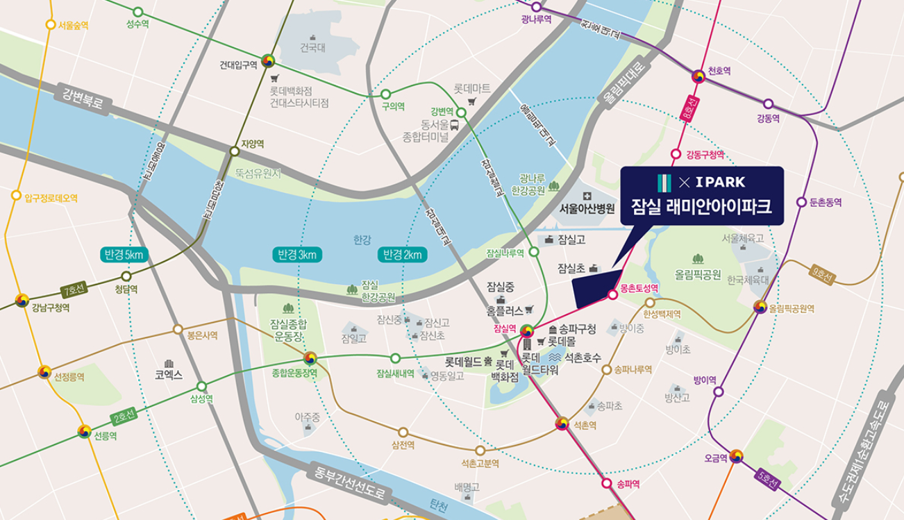 •  8호선 몽촌토성역 초역세권과 올림픽공원의 영구 숲세권을 동시에 소유하는 입지입니다. 잠실역(2호선)과 한성백제역(9호선)을 아우르는 트리플 역세권망은 강남 업무지구와 바로 연결되는 고소득층의 핵심 이동 경로를 장악하고 있습니다.